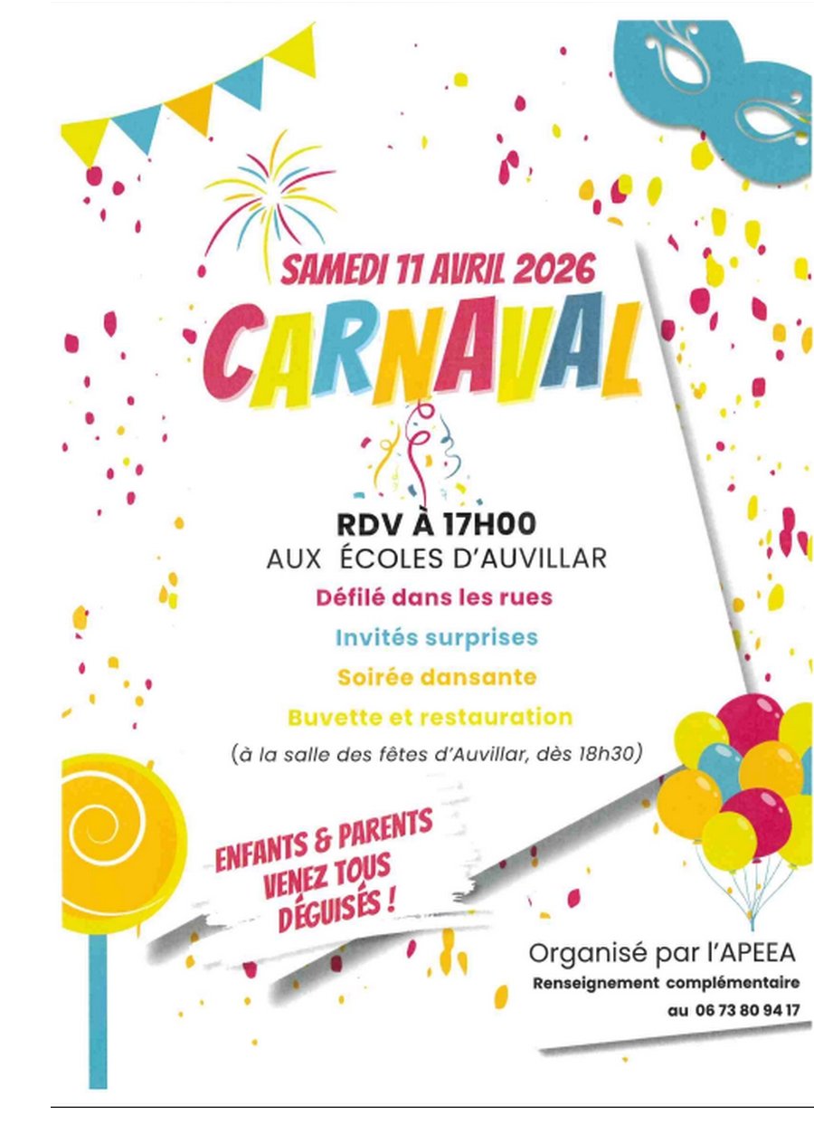 L’association des parents d’élèves organise le carnaval des écoles dès 17heures (défilé dans les rues d’AUVILLAR) suivi d’une animation, restauration et buvette à la salle des fêtes.
